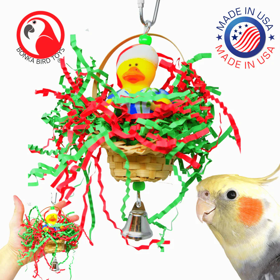 Introduce your small feathered friend to the Twinkle Duck Hat Basket, a delightful and shreddable toy that promises to add fun and color to their day. This enchanting toy features a cute yellow rubber duck nestled in a woven palm basket, surrounded by a bed of green and red colorful shreddy paper, making it an irresistible attraction for any bird.