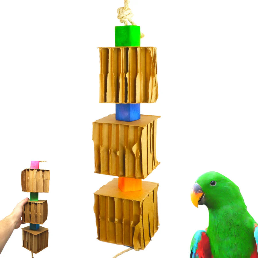 Big Trio Blocks N Cube is a large and shreddable blocky toy. This big bird toy has beak friendly cardboard squares to shred apart. The toy does include a quick link connector at the top for fast hanging in the aviary. A natural twine rope loops around the connector and continues through the center of the toy ending with a knot and a long strip of rope on the bottom. The body of the bird toy is made from (3) large sized cardboard shred blocks. These blocks are easy for beaks and feet to grab and great fun to shred apart. Interspacing each of the blocks and on the top and bottom are colorful wooden chew blocks. As your pet grabs and plays with the toy it will move all about and change its shape making for an exciting time.