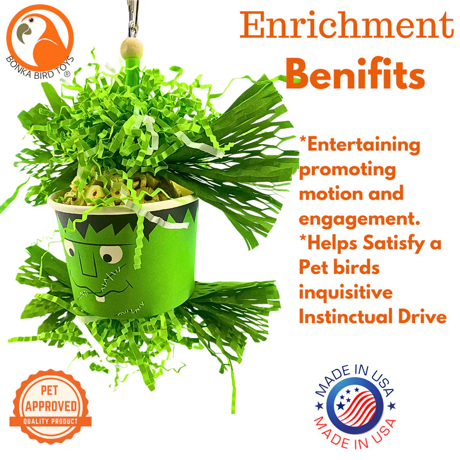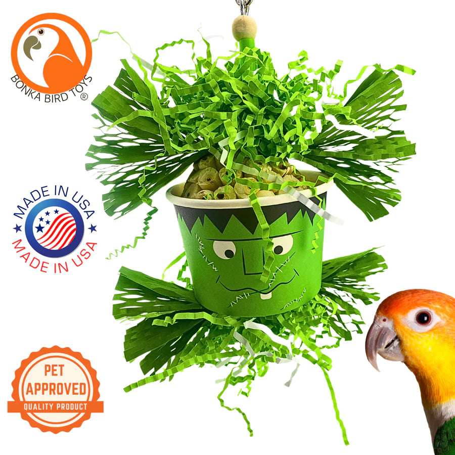* Festive Frankenstein Decoration: A colored, cardboard Frankenstein dish adds seasonal charm, making this toy a standout in any bird's cage.